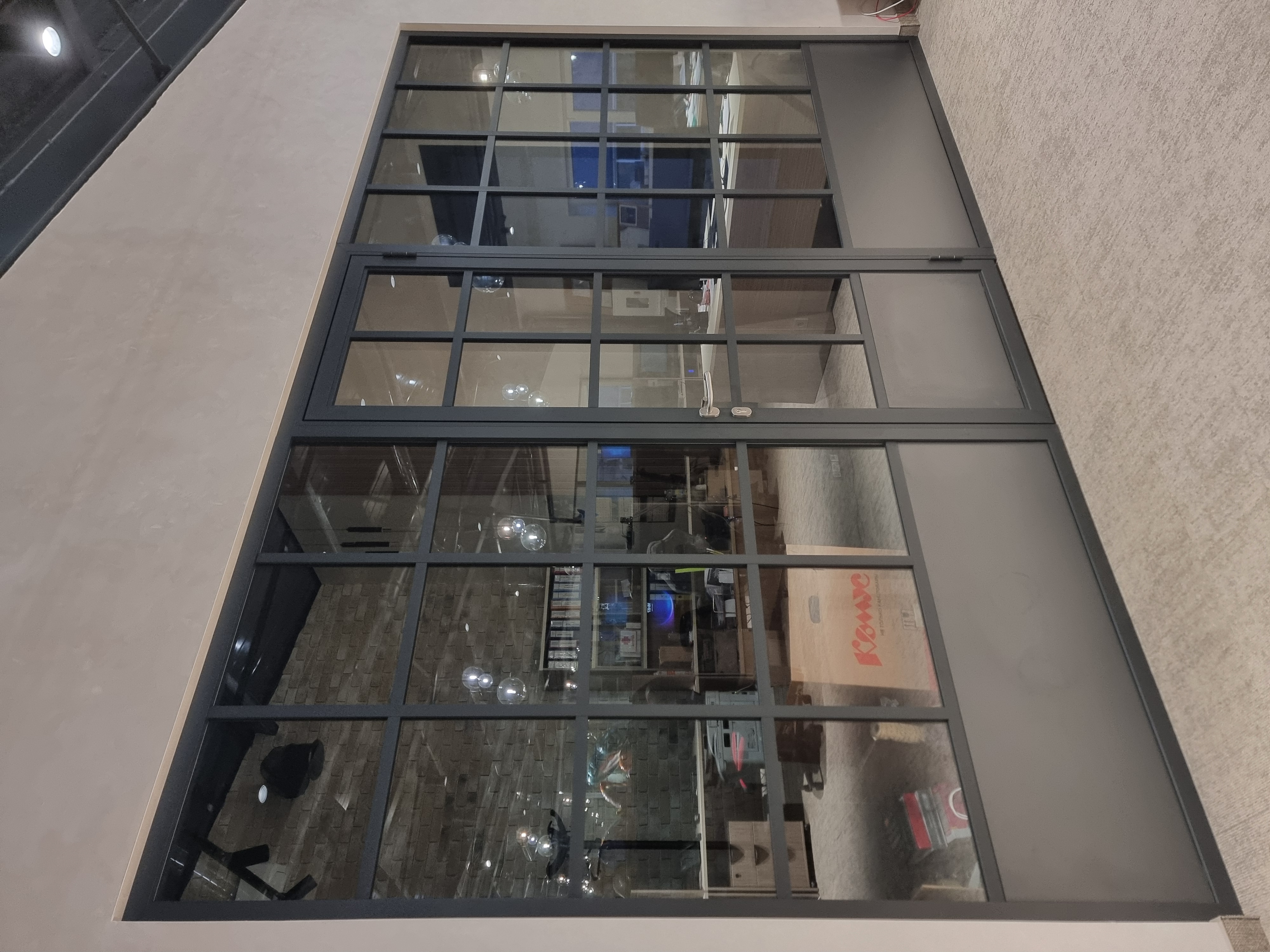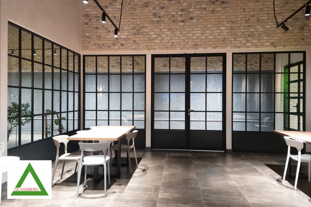 Конструктивное решение - цельностеклянная перегородка с одинарным остеклением.