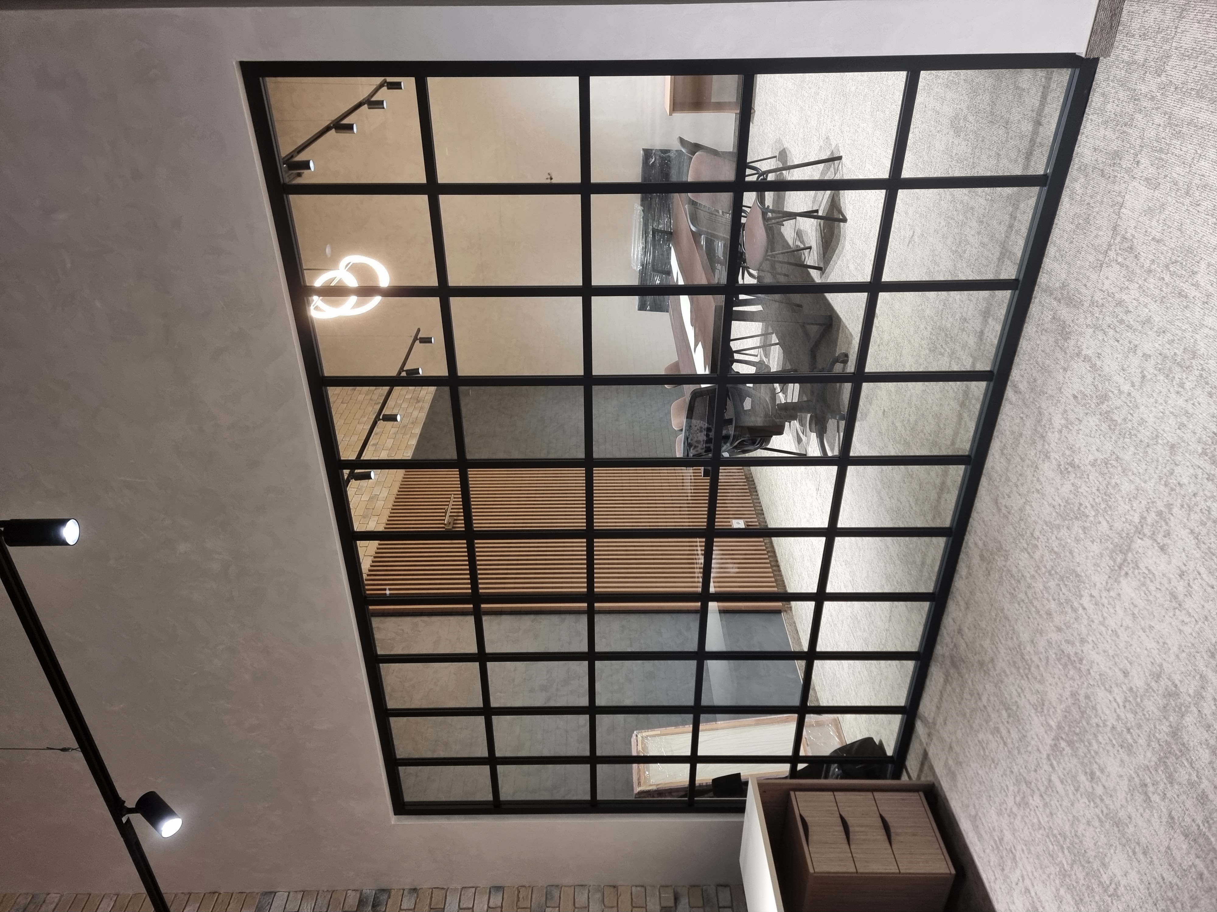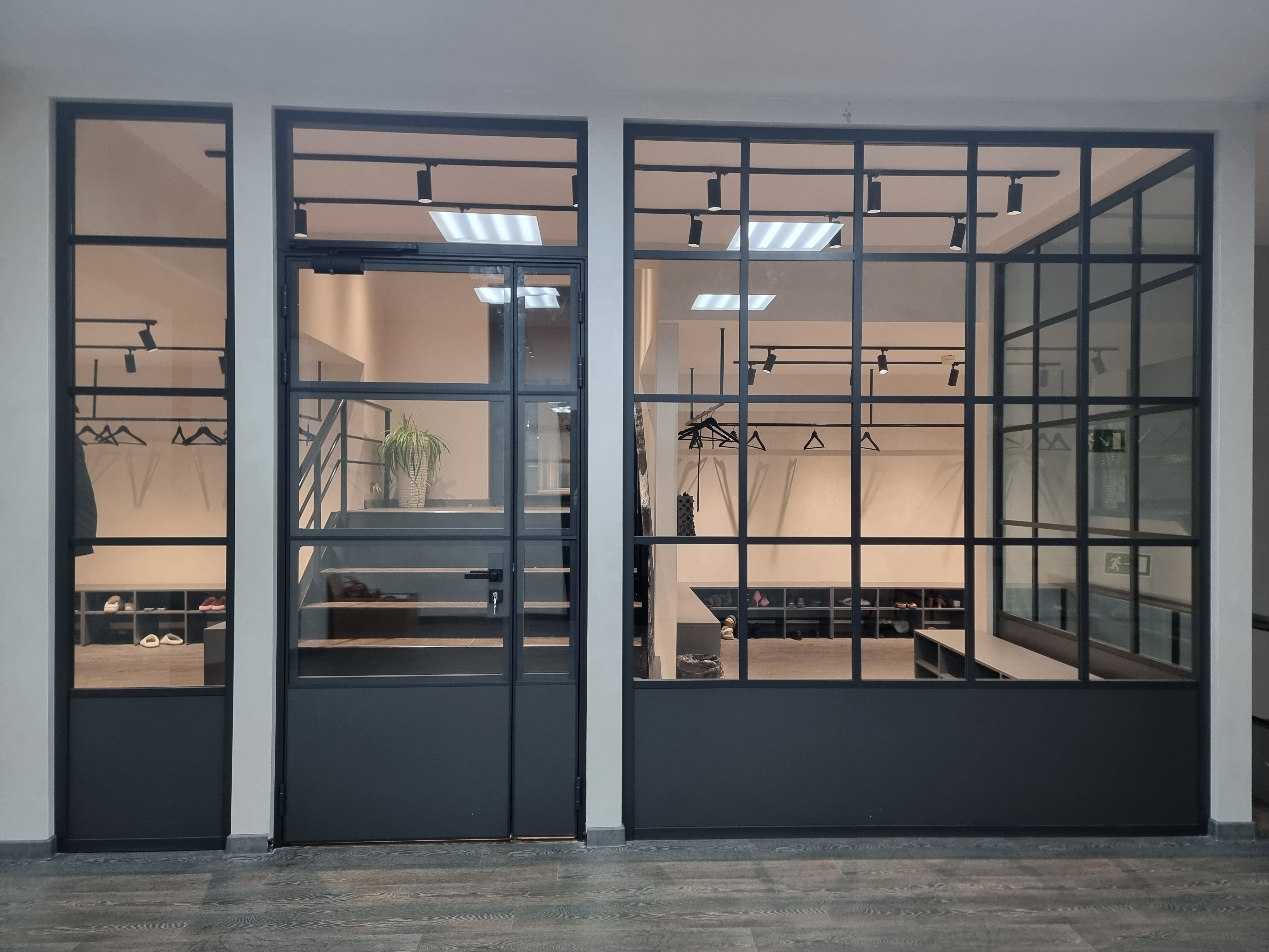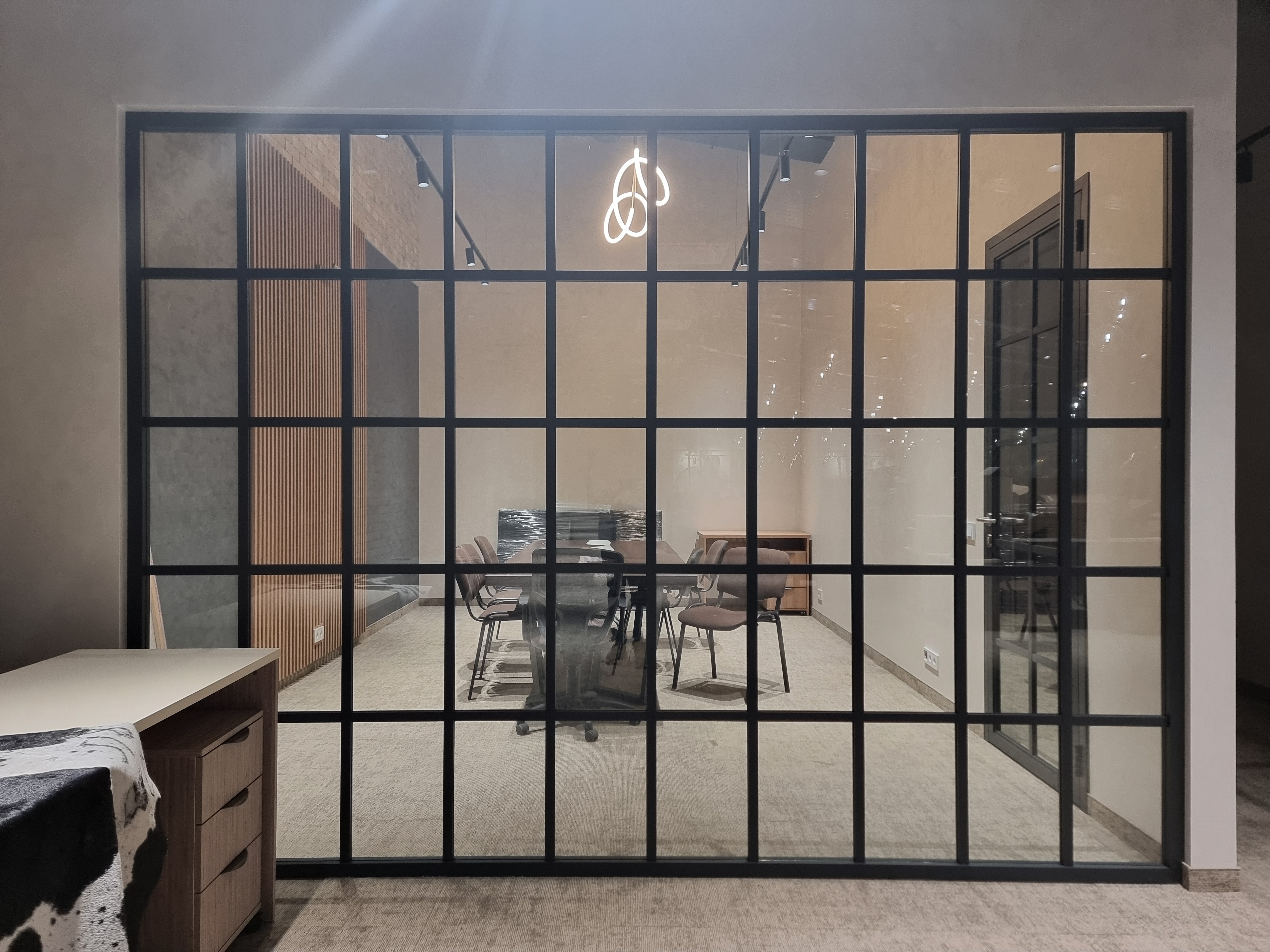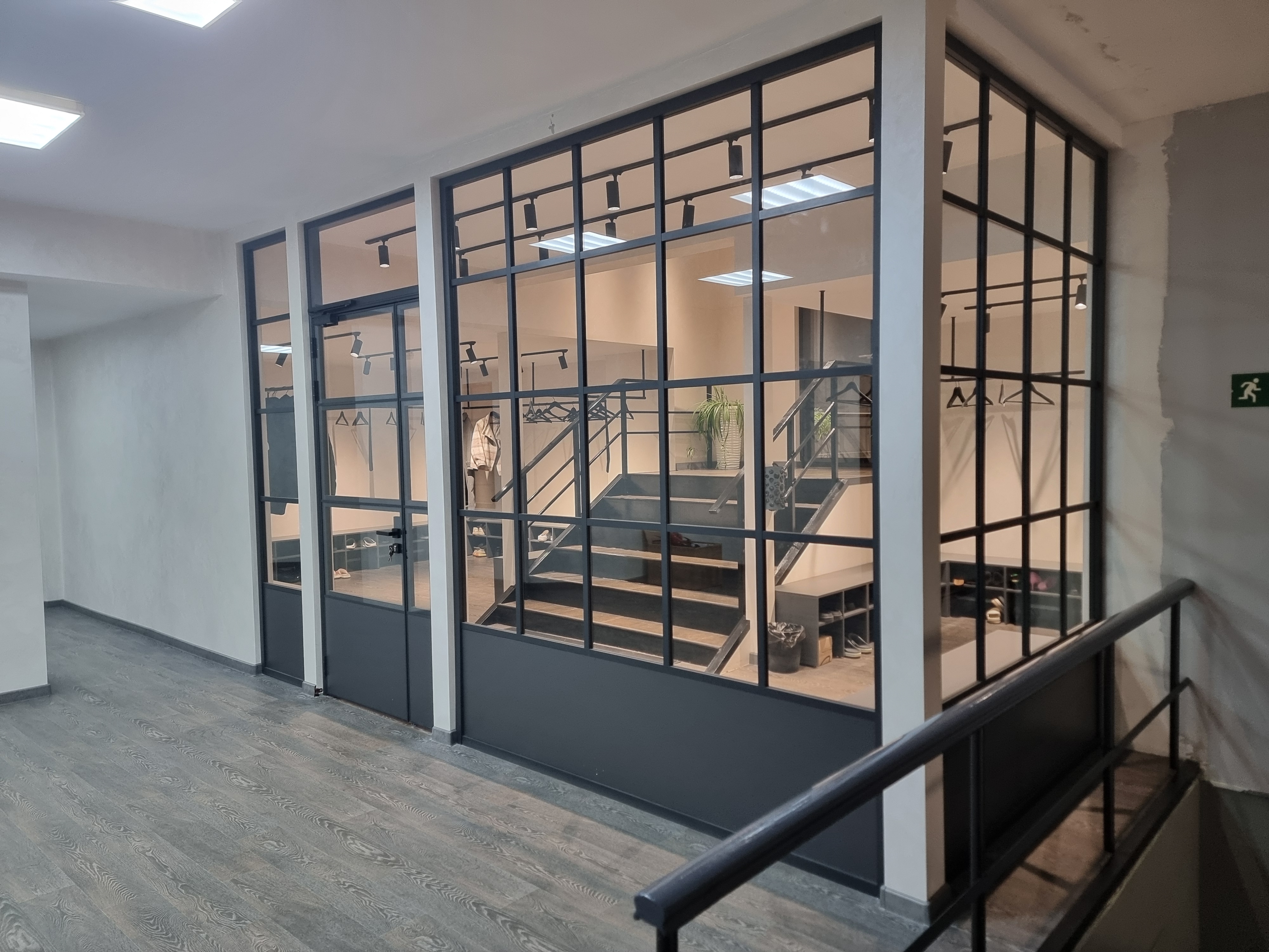 Перегородки реализованы в стиле Loft с применением профилей и комплектующих FS.Model 1.